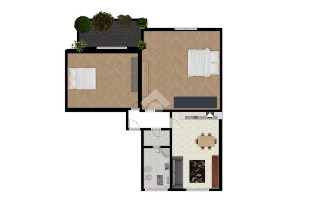 Una scala comune ci conduce al primo piano dove si accede all'abitazione. Ingresso nel disimpegno che porta al soggiorno e alla cucina abitabile con accesso al ballatoio, camera matrimoniale servita da un comodo balcone con affaccio sul Corso Garibaldi e bagno con doccia.