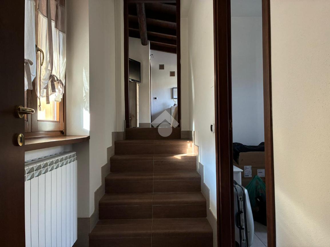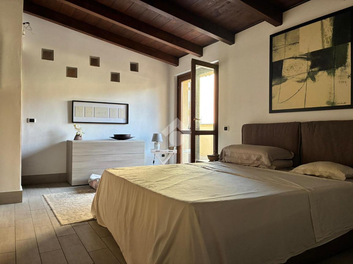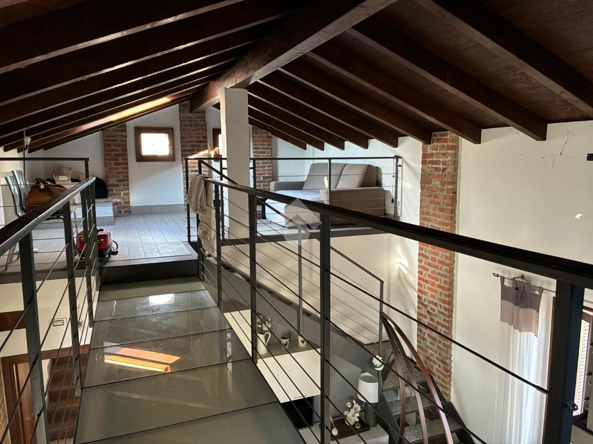 Dal soggiorno, una scala conduce al soppalco, in cui sono presenti una zona relax e uno studio, impreziosito dalle travi a vista, che donano carattere e un importante valore aggiunto all’abitazione.