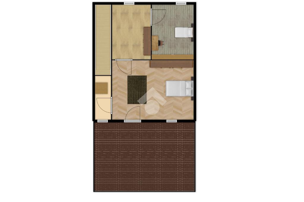 Al primo piano, un ulteriore disimpegno accompagna alla zona notte composta da due camere da letto e un terrazzo.