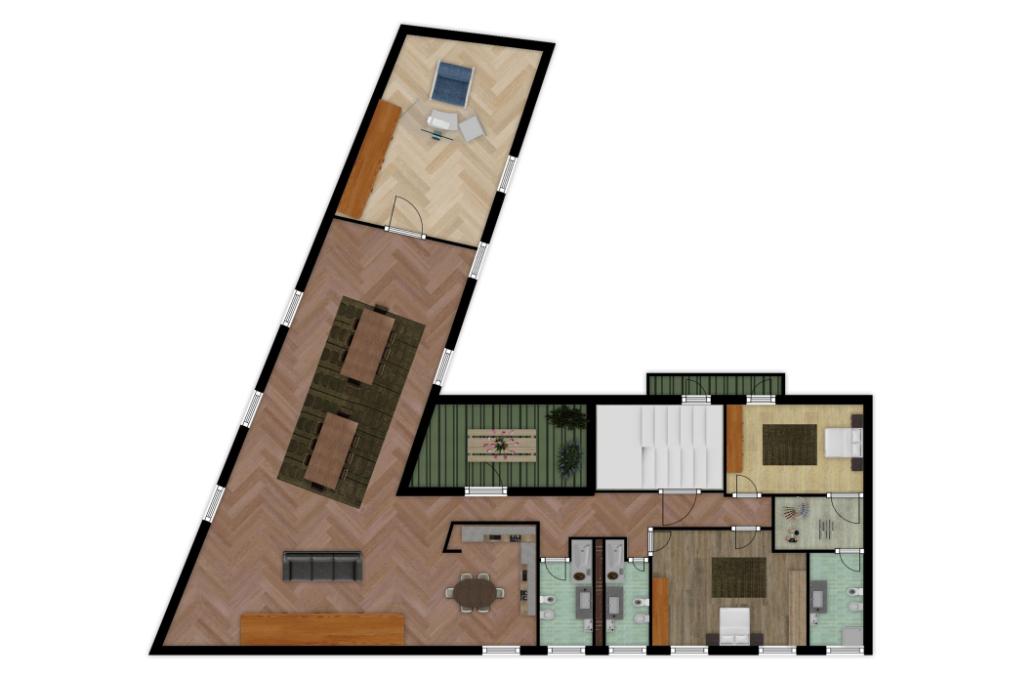 I 248 mq. della casa, varcata la soglia dell'abitazione, vengono valorizzati da una zona giorno di notevole dimensioni impreziosita dalle travi a vista, dal parquet in aframosia con inserti in pietra, dalle ampie vetrate che affacciano sul cortile/giardino interno. Parte integrante della zona giorno, anche se opportunamente ubicata in una zona riservata dagli occhi indiscreti, una cucina abitabile a vista che offre la possibilità a chi cucina di poter interagire con gli ospiti che nel frattempo godono della zona living. A completamento un ulteriore locale di oltre 35 mq. adibito a studio e un terrazzo di 22 mq.