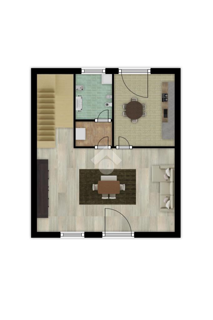 Ingresso diretto al piano terra in soggiorno, cucina abitabile con uscita su giardino privato, disimpegno che conduce ad un bagno finestrato con doccia.