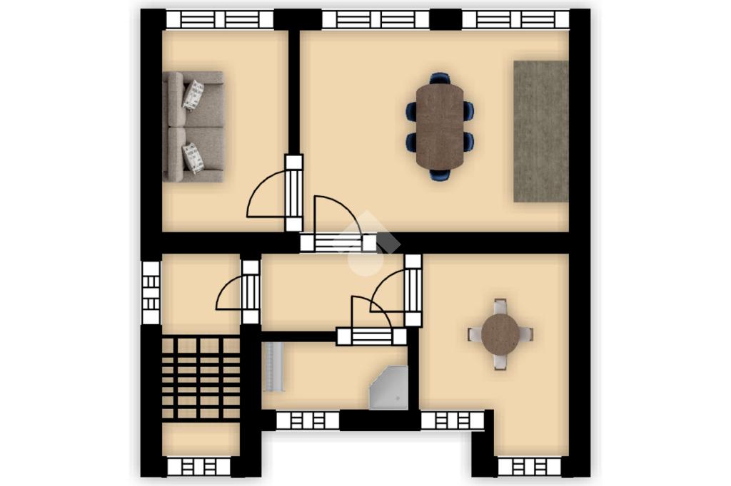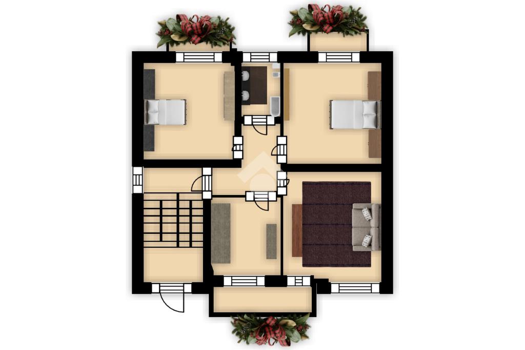 L’ingresso, protetto da porta blindata, si apre su un vano scale che funge da snodo tra i piani, rendendo i due appartamenti (uno al rialzato e uno al primo piano) completamente autonomi, soluzione ideale per due nuclei familiari o per un unico grande progetto.